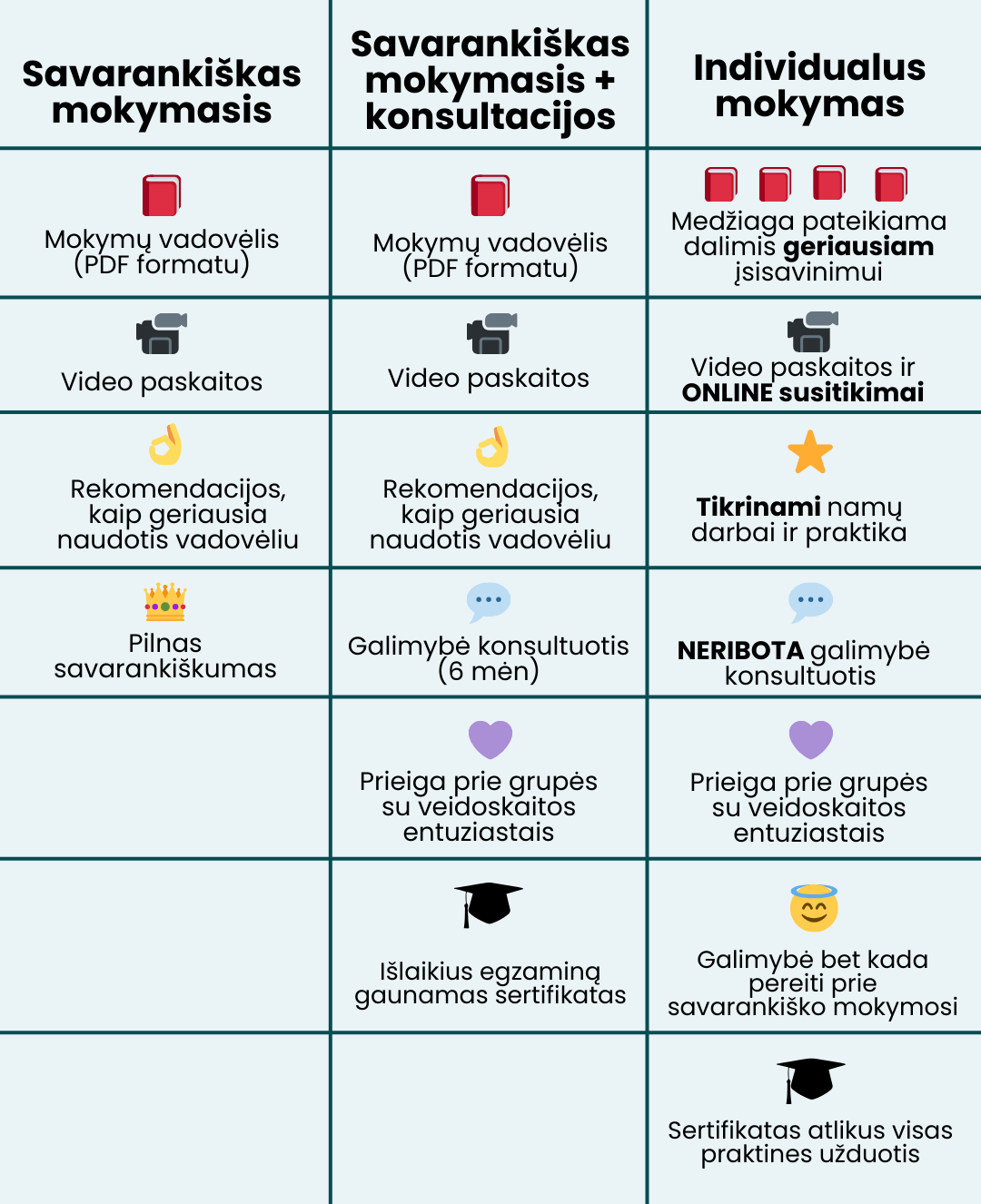 ✔ Su mokymais startuoja kiekvienas individualiai, pasirinkdamas sau tinkamiausią mokymosi paketą
